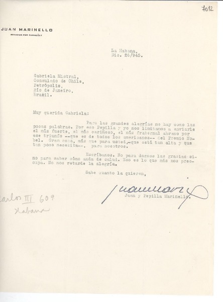 [Carta] 1945 dic. 26, La Habana [a] Gabriela Mistral, Petrópolis, Río de Janeiro, Brasil [manuscrito] Juan y Pepilla Marinello.