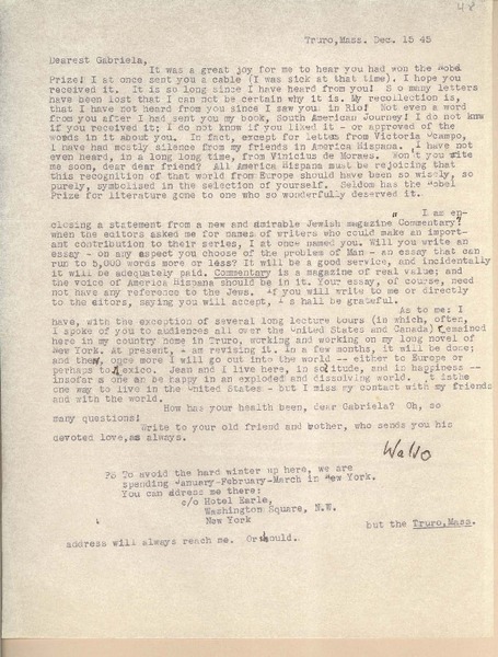 [Carta] 1945 Dec. 15, Truro, [Massachusetts], [EE.UU.] [a] Gabriela [Mistral] [manuscrito] Waldo Frank.