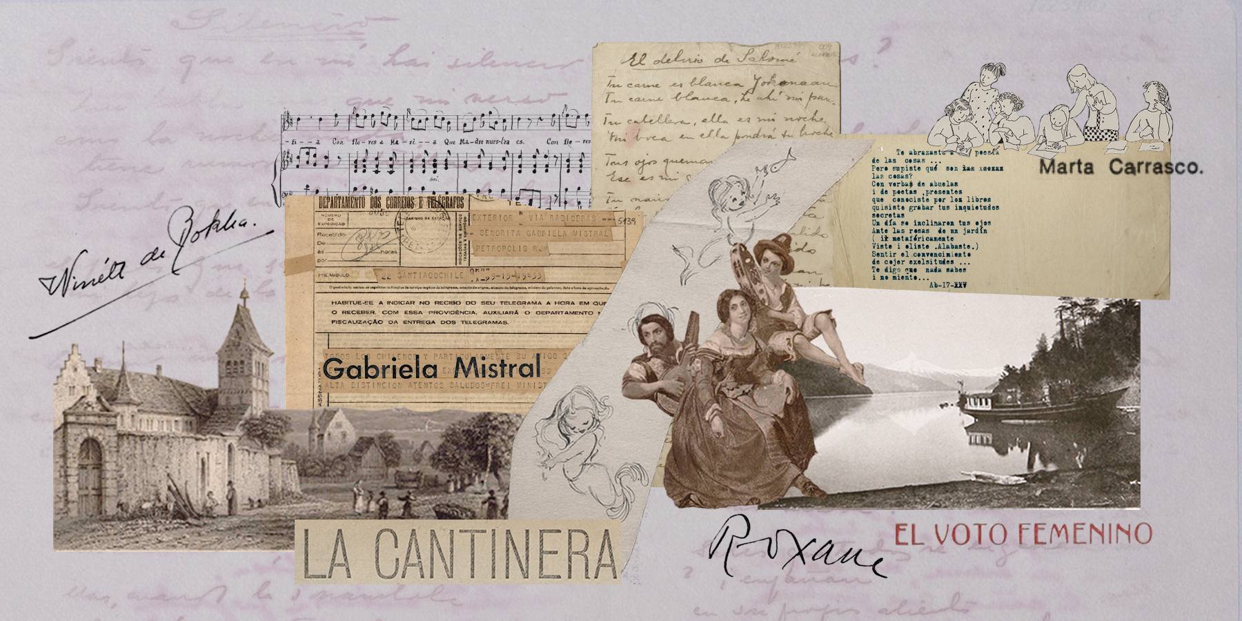 Imagen principal: investigaciones y digitalizaciones de mujeres chilenas en 2025Collage con elementos gráficos provenientes de digitalizaciones de Memoria Chilena, Chile para Niños y Biblioteca Nacional Digital.