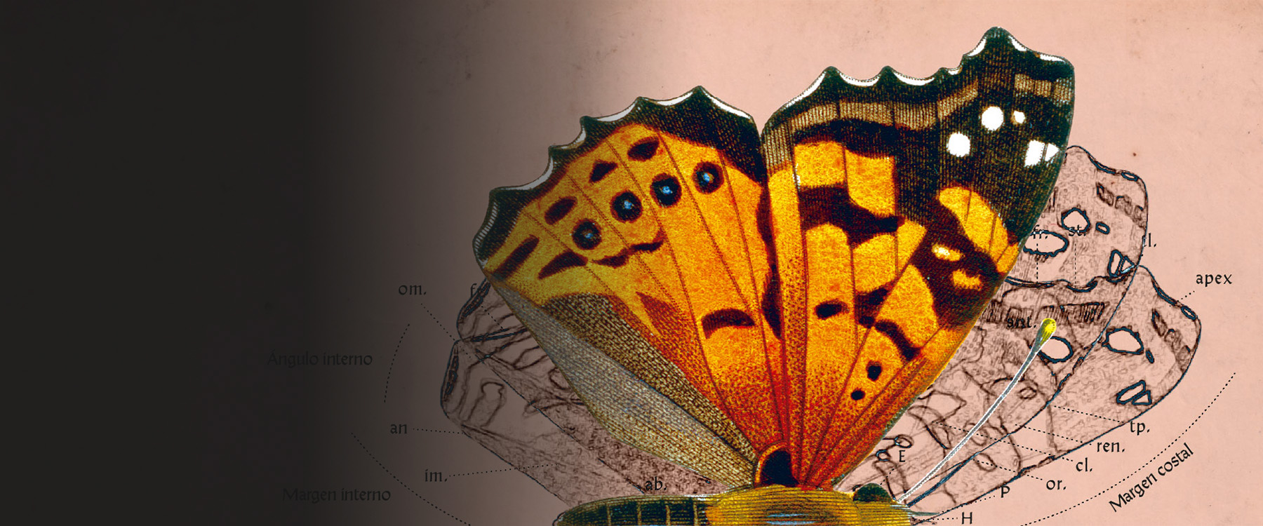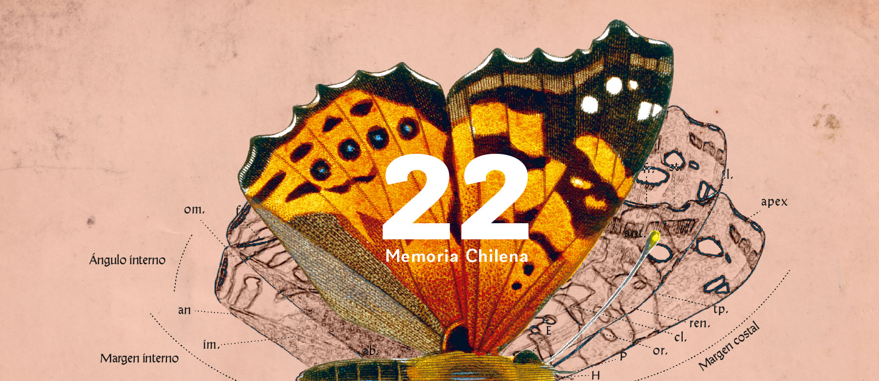 Gráfica para el 22° aniversario de Memoria ChilenaEsta imagen fue construida a partir de la ilustración de la mariposa Vanessa Carye proveniente del Atlas de la Historia Física y Política de Chile de Claudio Gay. La composición gráfica representa, a través de las tres fases del vuelo de la mariposa, las diversas capas de trabajo detrás de los contenidos de Memoria Chilena.