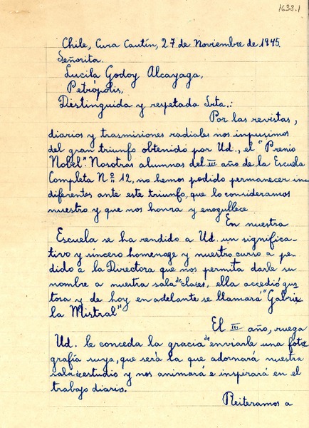 [Carta] 1945 nov. 27, Curacautín, Chile [a] Lucila Godoy Alcayaga, Petrópolis, [Brasil] [manuscrito] Alumnas del III año de la Escuela Completa N°12 de Curacautín.