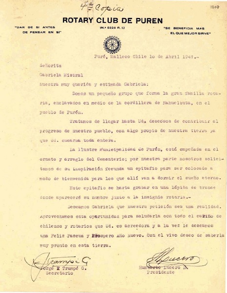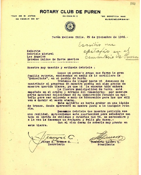 [Carta] 1946 dic. 29, Purén, Malleco, Chile [a] Gabriela Mistral, Los Ángeles, California [manuscrito] Rotary Club de Purén.