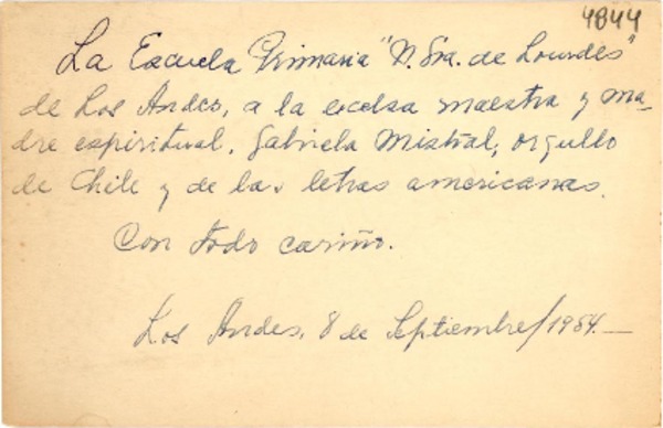[Carta] 1945 nov., Los Andes, [Chile] [a] Gabriela Mistral [manuscrito] Academia Literaria "Gabriela Mistral" del Liceo de Los Andes.
