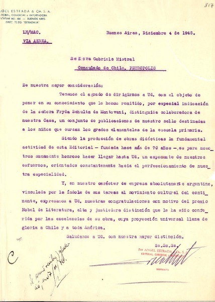 [Carta] 1945 dic. 4, Buenos Aires, [Argentina] [a] Gabriela Mistral, Consulado de Chile, Petrópolis, [Brasil] [manuscrito] Angel Estrada & Cía.