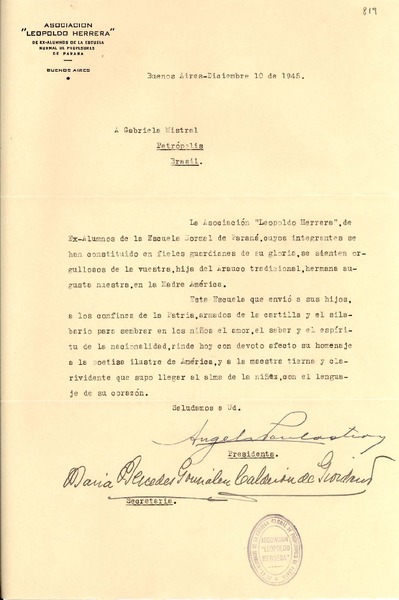 [Carta] 1945 dic. 10, Buenos Aires, [Argentina] [a] Gabriela Mistral, Petrópolis, Brasil [manuscrito] Asociación Leopoldo Herrera.