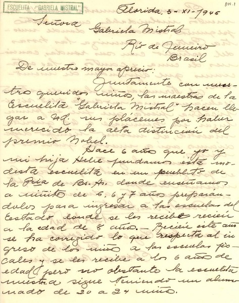 [Carta] 1945 nov. 3, Florida, [Buenos Aires, Argentina a] Gabriela Mistral [manuscrito]
