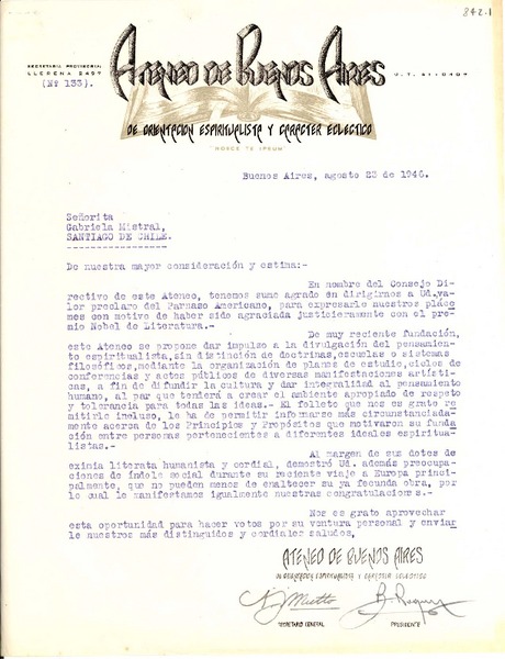 [Carta] 1946 ago. 23, Buenos Aires [a] Gabriela Mistral, Santiago de Chile [manuscrito] Ateneo de Buenos Aires.