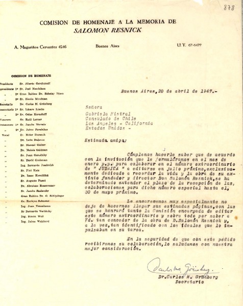 [Carta] 1947 abr. 20, Buenos Aires, Argentina [a] Gabriela Mistral, Consulado de Chile, Los Angeles, California, Estados Unidos [manuscrito] Comisión de Homenaje a la Memoria de Salomon Resnick.