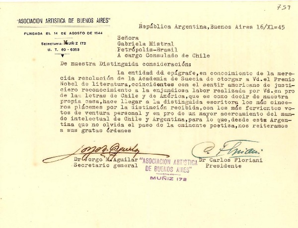 [Carta] 1945 nov. 16, Buenos Aires, República Argentina [a] Gabriela Mistral, Petrópolis, Brasil [manuscrito] Asociación Artística de Buenos Aires.