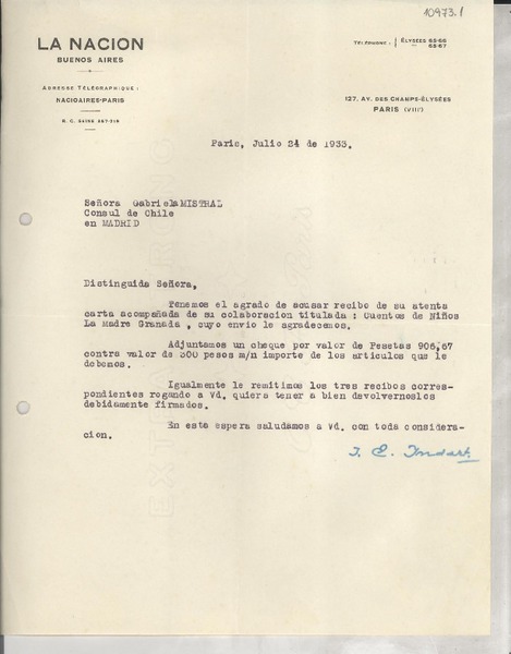 [Carta] 1933 jul. 24, Paris, [Francia] [a] Gabriela Mistral, Cónsul de Chile en Madrid, [España] [manuscrito] J. C. Indart.