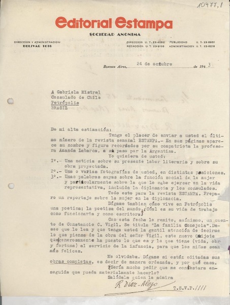 [Carta] 1943 oct. 24, Buenos Aires, [Argentina] [a] Gabriela Mistral, Consulado de Chile, Petrópolis, Brasil [manuscrito] R. Díaz-Alejo.