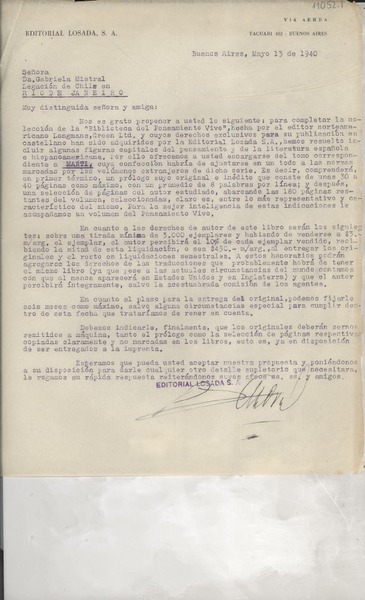 [Carta] 1940 mayo 13, Buenos Aires, [Argentina] [a] Gabriela Mistral, Legación de Chile, Rio de Janeiro, [Brasil] [manuscrito] Editoral Losada.