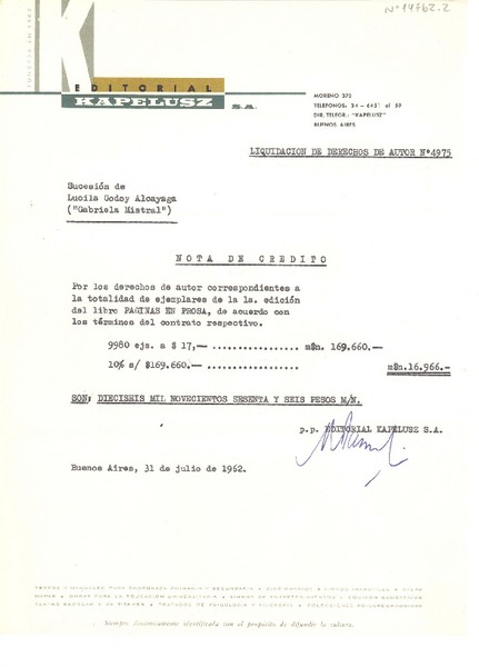 [Carta] 1962 jul. 31, Buenos Aires, [Argentina] [a] Sucesión de Lucila Godoy Alcayaga ("Gabriela Mistral") [manuscrito] Editorial Kapeluz S.A.
