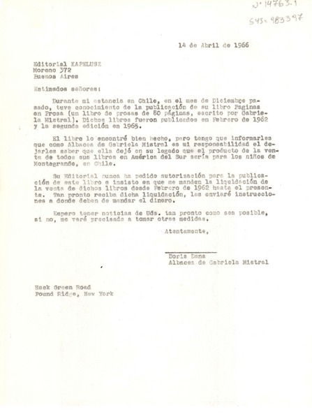 [Carta] 1966 abr. 14, Hack Green Road, Pound Ridge, New York, [Estados Unidos] [a] Editorial Kapelusz, Buenos Aires, Argentina [manuscrito] Doris Dana.