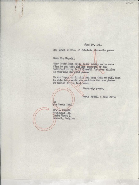 [Carta] 1961 June 19, [New York], [EE.UU.] [a] Mr. L. Nagels, Hasselt, Belgium [manuscrito] Marie Rodell and Joan Daves.