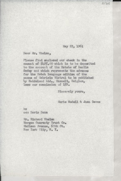 [Carta] 1961 May 22, [EE.UU.] [al] Dear Mr. Richard Whelan, Morgan Guaranty Trust Co., New York City, [EE.UU.] [manuscrito] Marie Rodell and Joan Daves.