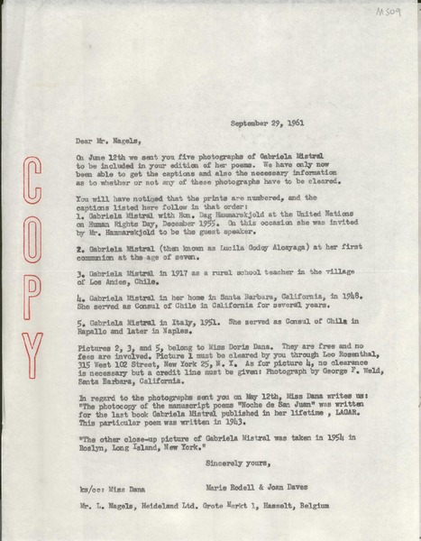 [Carta] 1961 Sept. 29, [EE.UU.] [a] Mr. L. Nagels, Heideland Ltd., Hasselt, Belgium [manuscrito] Marie Rodell & Joan Daves.