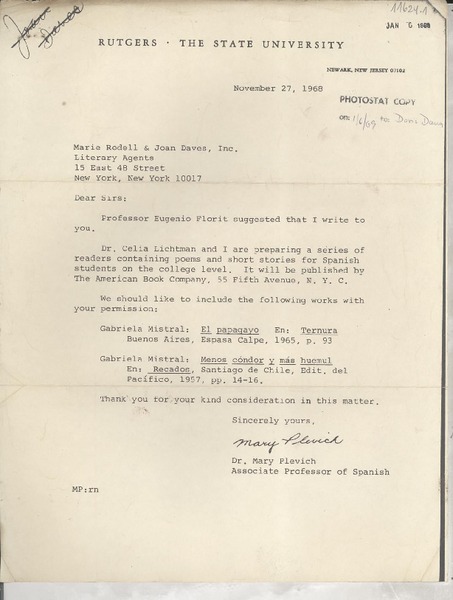 [Carta] 1968 Nov. 27, Newark, New Jersey, [EE.UU.] [a] Marie Rodell and Joan Daves, Inc., Literary Agents, New York, [EE.UU.] [manuscrito] Mary Plevich.