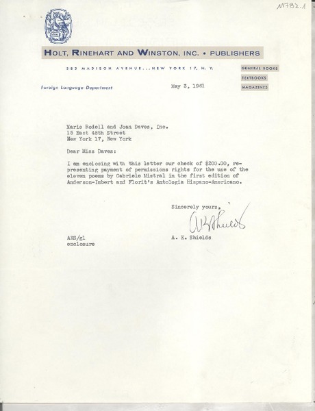 [Carta] 1961 May 3, New York, N. Y., [EE.UU.] [a] Marie Rodell and Joan Daves, Inc., New York, New York, [EE.UU.] [manuscrito] A. K. Shields.