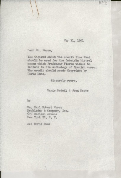 [Carta] 1961 May 11, [EE.UU.] [a] Mr. Carl Robert Morse, Doubleday & Company, Inc., New York, N. Y., [EE.UU.] [manuscrito] Marie Rodell and Joan Daves.