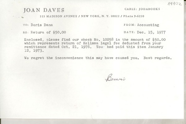 [Carta] 1977 Dec. 15, 515 Madison Avenue, New York, N. Y. 10022, [EE.UU.] [a] Doris Dana, [EE.UU.] [manuscrito] Joan Daves.