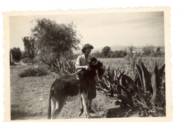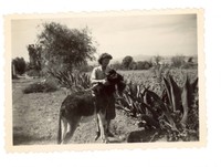 Doris Dana junto a unas plantas de agave y acariciando un burro, al que describe como "su animal favorito en el país", en un camino rural de México.