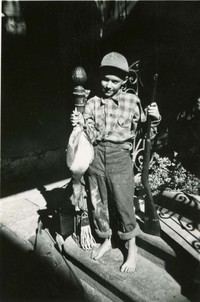 Muestra a un niño no identificado en México posando descalzo, al pie de una escalera, llevando en una mano un arma de caza y en la otra un pato.