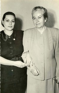Gabriela Mistral tomada del brazo de Cristina Emparan de Suzarte, quien le dedica la fotografía.
