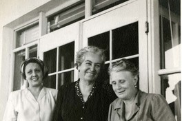Gabriela Mistral posando junto a dos mujeres no identificadas en la galería de una edificación en México.