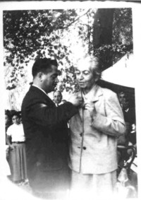 Gabriela recibiendo una condecoración por el Alcalde del pueblo de Vicuña.