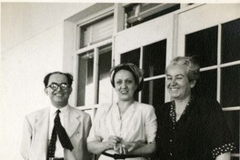 Gabriela Mistral de pie posando junto al Doctor Ignacio Chávez y una mujer no identificada en la galería de una edificación en México.