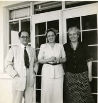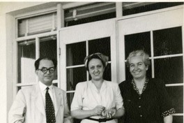 Gabriela Mistral posando tomada del brazo de una mujer no identificada y junto al Doctor Ignacio Chávez, en la galería de una edificación en México.