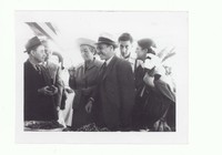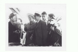Gabriela Mistral llevando un sombrero, paseando en un mercado en México con Consuelo Saleva y otros hombres no identificados.