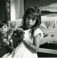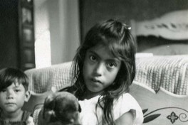 Muestra a un niño y una niña no identificados, cada uno sosteniendo un perro, en el interior de un dormitorio en México.