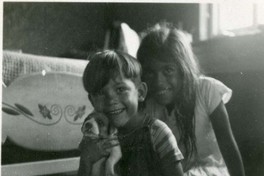 Aparecen un niño y una niña no identificados sentados en el suelo, llevando el niño un perro en sus brazos, en el interior de un dormitorio en México.