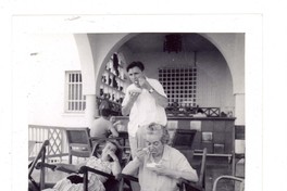 Gabriela Mistral sentada en una galería del Hotel Mocambo en Veracruz (México) tomando helado, junto a un hombre no identificado de pie, también tomando helado, y Candelaria Escolá recostada en una reposera.