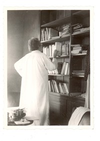 Gabriela Mistral en camisón y de pie consultando los libros de una estantería en una habitación en México.
