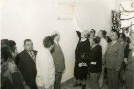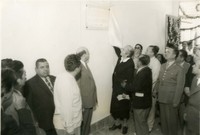 Gabriela Mistral descubriendo una placa conmemorativa durante la ceremonia de inauguración del "Jardín de niños Gabriela Mistral" en Fortín, Veracruz (México), mientras la rodean el General Cándido Aguilar, el gobernador de Veracruz Angel Carvajal, Antonio Ruiz Galindo y otras personas no identificadas.