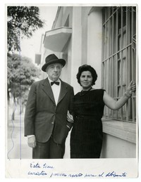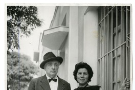 [Retrato de Joaquín Edwards Bello junto a Martha Albornoz] [fotografía]. Santiago, Chile : [Editor no identificado], [1965]. 1 fotografía : Monocromo blanco y negro, papel brillante, 23,5 x 18 cm .