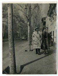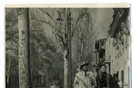 Retrato de Joaquín Edwards Bello caminando junto a su esposa Martha Albornoz.