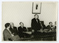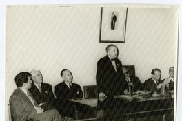 Joaquín Edwards Bello agradeciendo el Premio Nacional de Periodismo junto a Manuel Rojas, Luis Oyarzún y otras personas no identificadas.