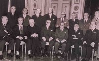 Reunión de escritores, de pie: Eugenio Pereira, Ángel Pino, Jaime Eyzaguirre, Ricardo Latcham, F. Durán, Lautaro García, Juan Guzmán Cruchaga, Julio Barrenechea. Sentados: Raúl Silva Castro, Alone, Fidel Araneda, E. Garretón, Rodolfo Oroz, A. Iglesias y Roque Scarpa.