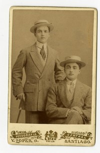 [Retrato de Joaquín Edwards junto a Arturo Lamarca] [fotografía]. Santiago, Chile : [V. López G. Fotografía Central], 1916. 1 fotografía : Monocromo blanco y negro, papel brillante, 8,6 x 5,4 cm/7,1 x 5 cm .