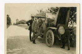 Joaquín Edwards Bello, junto a dos personas en un auto parado en un camino.