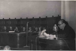 Juan Guzmán Cruchaga en el Salón de Honor de la Universidad de Chile. Leyendo algunas palabras Julio Barrenechea Pino.