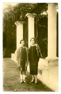 Magdalena Petit junto a una de sus hermanas, bajo el parrón de su casa. Santiago 25 de abril de 1925.