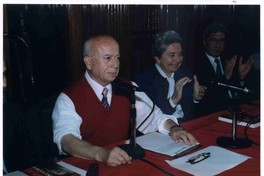 Gonzalo Rojas junto a Marta Cruz-Coke y Eduardo Morales. Presentación del Libro "Porqué Escribí" de Enrique Lihn, en la Sala Ercilla de la Biblioteca Nacional..