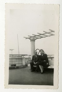 Vicente Huidobro junto a una mujer no identificada en una terraza de un edificio ubicado cerca del Cerro Santa Lucia en Santiago, Chile.