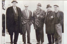Gonzalo Rojas junto a Manuel Rojas, Hernán San Martin, Pablo Neruda y Fernando Alegría en San Vicente, Talcahuano.