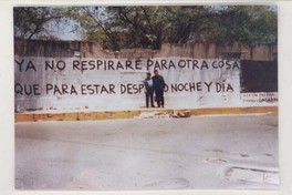 Gonzalo Rojas junto a una persona no identificada, posando delante de un muro escrito con una frase del poeta "Ya no respiraré para otra cosa que para estar despierto noche y día".
